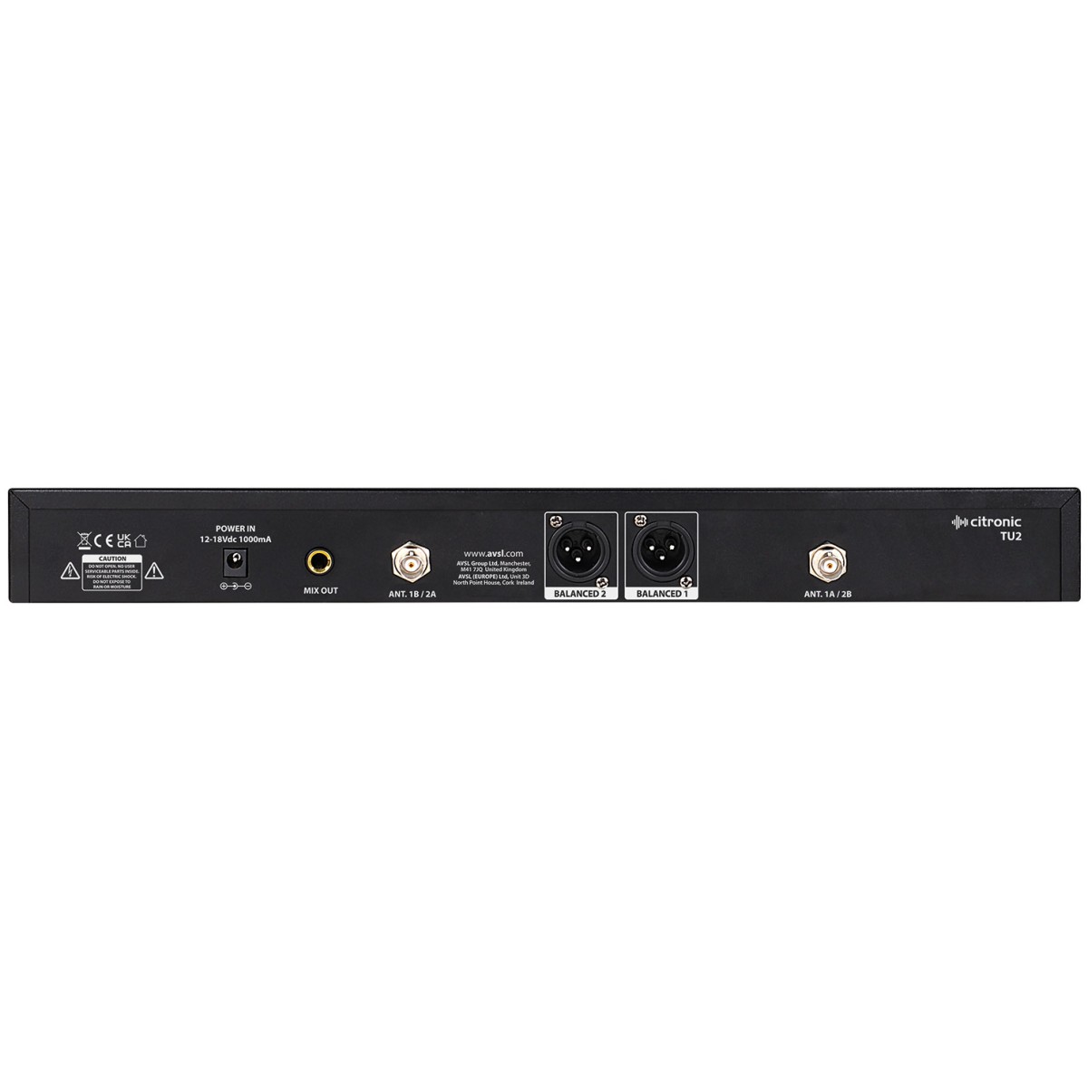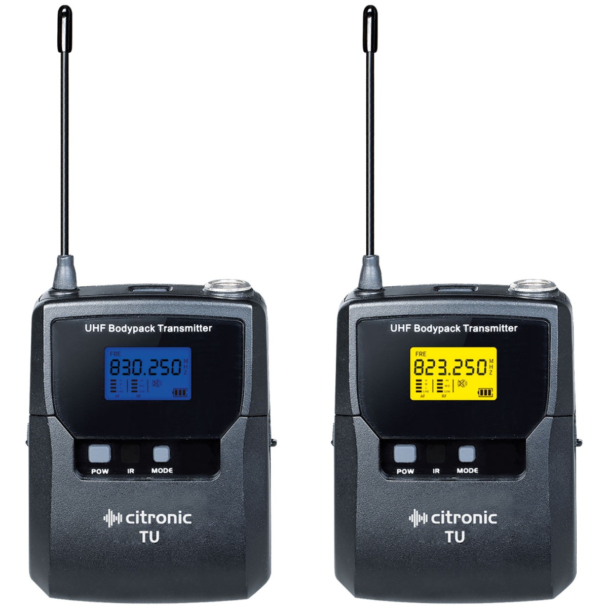 Profesionální 2-kanálový bezdrátový mikrofonní set se dvěma kapesními vysílači (bodypacky) Citronic TU4-BTX (SA171047), dvěma náhlavními mikrofony Citronic FCN-XLR (SA171048) a dvěma klopovými mikrofony Citronic LM-XLR (SA171049). Programovatelné kanály se automaticky synchronizují s vysílačem a nastavují přenosovou frekvenci v bezlicenčním pásmu UHF (863-865MHz) a regulovaném duplexním pásmu (823–832 MHz), 8 skupin po 8-16 nosných frekvencích, bezlicenční provoz, 7-pásmový ekvalizér, plně symetrické signálové připojení, bezdrátová synchronizace přes IR. Nastavení přijímače i vysílače se programuje pomocí plně barevného TFT displeje na předním panelu s otočným enkodérem pro nastavení parametrů. Individuálně programovatelné kanály se synchronizují s vysílačem a nastavují nosnou frekvenci, ekvalizér, vysílací výkon a barvu podsvícení displeje odlišnou pro každý kanál. Dvě BNC antény lze připojit na zadní stranu přijímače nebo na přední panel při montáži do 19" racku pomocí dodaných prodlužovacích BNC kabelů. Výstupní konektory XLR a Jack 6,3 mm. Vhodné k použití pro jevištní představení, konference, divadelní produkce a další vokální účely.